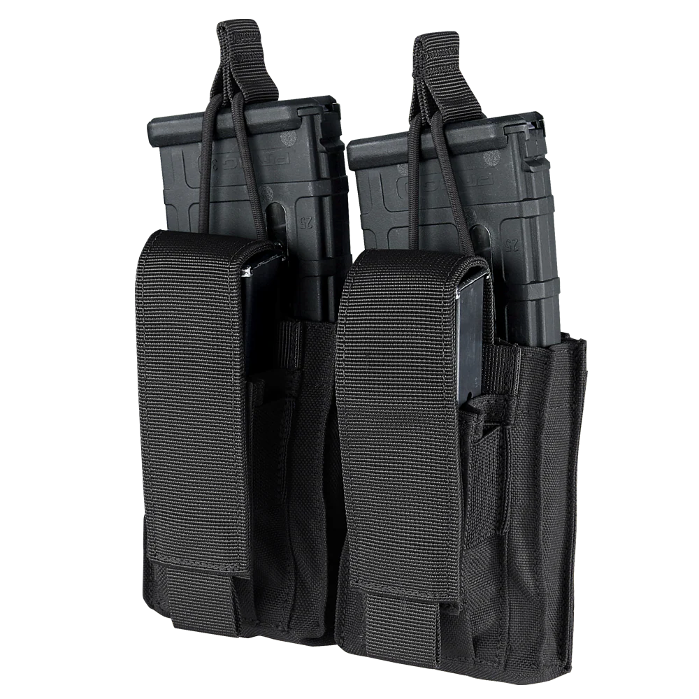 The Double Kangaroo Mag Pouch Gen II provides space for two AR/M4 mags and two pistol mags, combining quick access with security. The open-top design for AR/M4 magazines and adjustable flap for pistol magazines ensure your ammunition is ready when you are. The adjustable bungee cord retention offers a custom fit for each magazine.